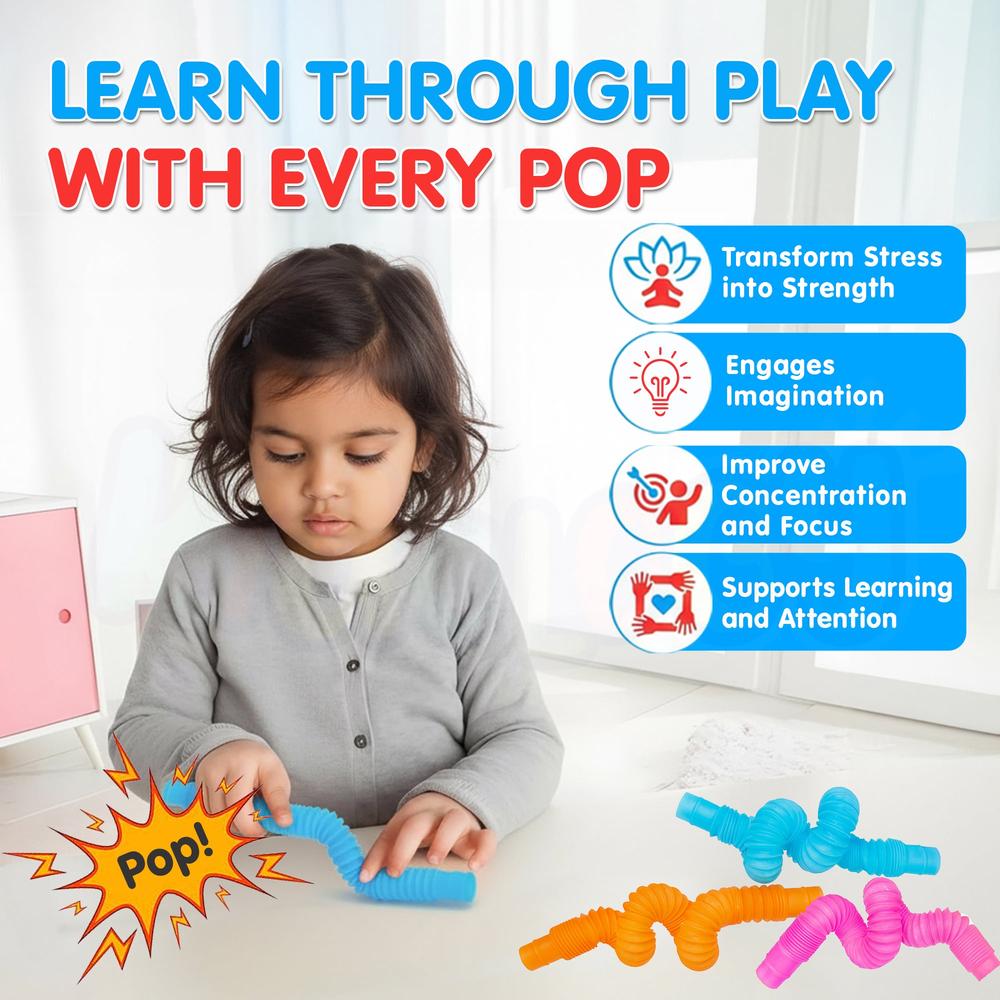 The Kidology Set of 6 Small Pop Tubes delivers endless sensory fun in a compact, kid-friendly size. Designed to stretch, bend, twist, and pop, these colorful tubes help develop fine motor skills, hand strength, and creativity through playful exploration. Each tube makes a satisfying popping sound that keeps little hands engaged while supporting sensory development and stress relief. Lightweight and durable, they’re perfect for home play, travel, classrooms, or party favors. Safe for kids and easy to use, this vibrant pop tube set turns simple movement into interactive fun that kids love and parents appreciate.